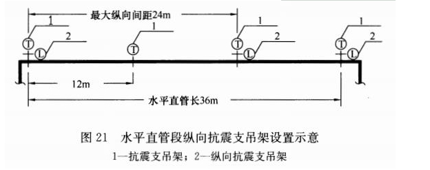 8.3.3 每段水平直管道應至少設置一個縱向抗震支吊架,當兩個縱向抗震支吊架距離大于最大設計間距,應按本規(guī)范第8.2.3條要求間距依次增設縱向抗震支吊架。例如:剛性連接金屬管道長為36m,按最大24m的間距依次設置縱向抗震支撐,直至所有支撐間距均滿足要求。(圖21)