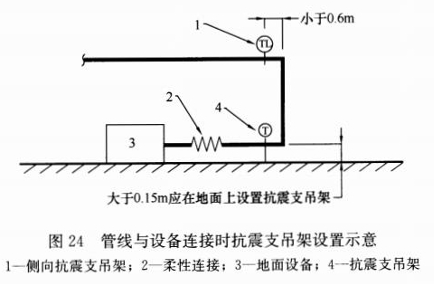 8.3.7當水平管線通過垂直管線與地面設備連接時,管線與設備之間應采用柔性連接,水平管線距垂直管線600mm范圍內(nèi)設置側(cè)向支撐,垂直管線底部距地面大于0.15m應設置抗震支撐(圖24)